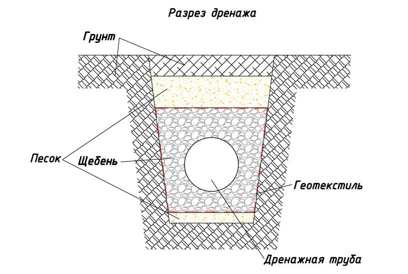 В траншею на подстилающий слой укладывается дренажная перфорированная труба с фильтром. Она обсыпается гравийным щебнем фракции 20–40 мм, заворачивается в обойму из геотекстиля и перекрывается грунтом обратной засыпки.